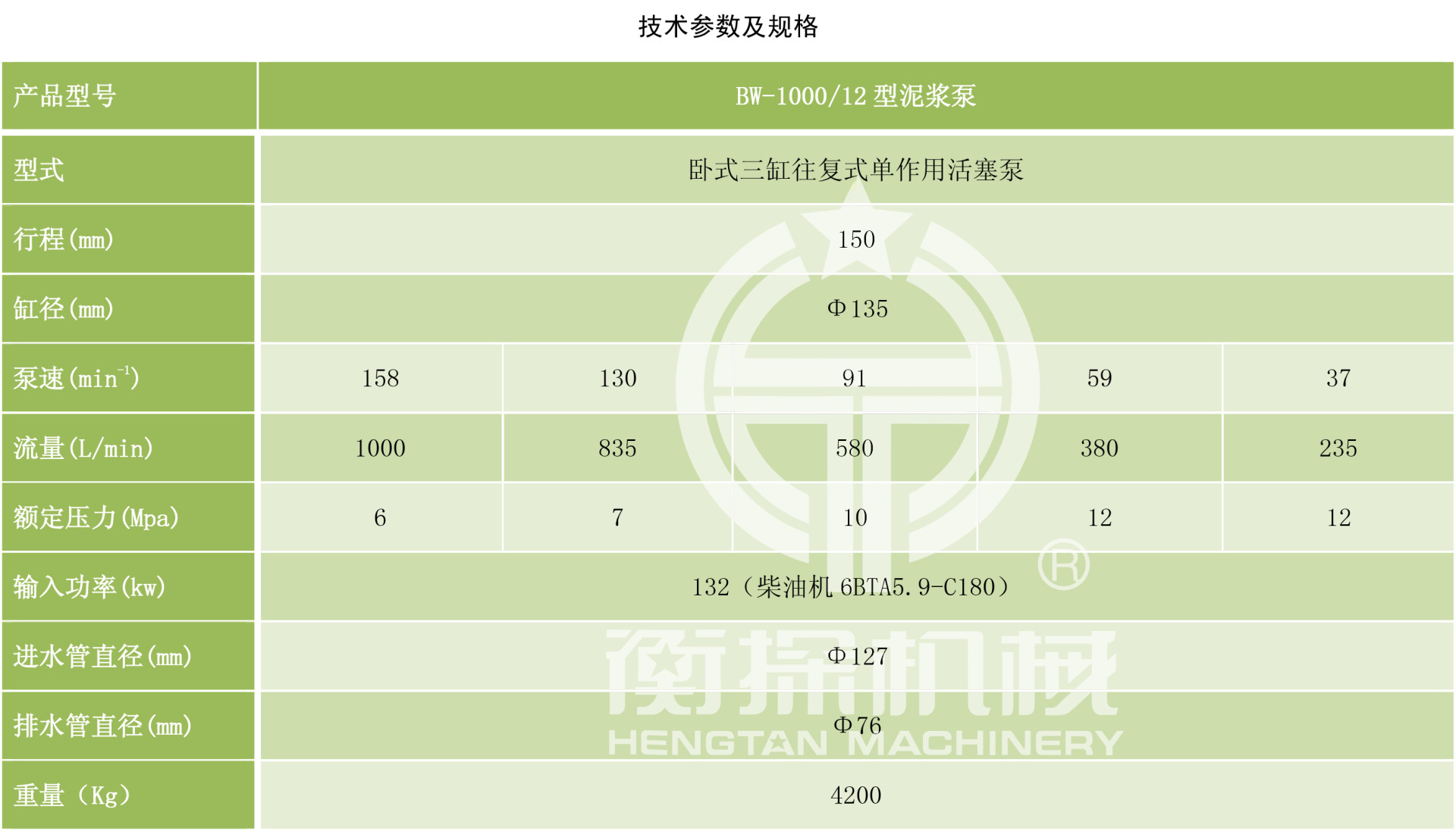 1.BW-1000/12型泥浆泵主要适用于与最大推拉力100吨左右的非开挖钻机配套使用,也可用于水井、地热井施工、矿井排水以及浅孔石油钻探施工;
