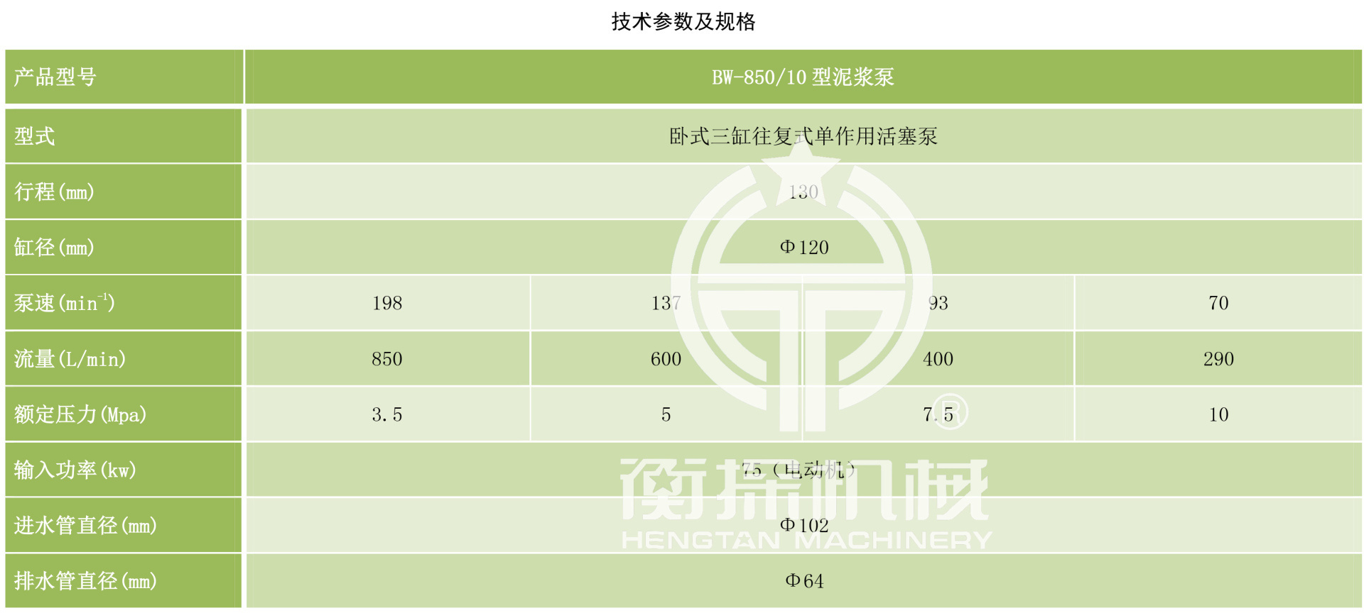 1.BW-850/10型泥浆泵是一种卧式三缸单作用往复式活塞泵。可采用液压马达、调速电机或柴油机进行驱动;