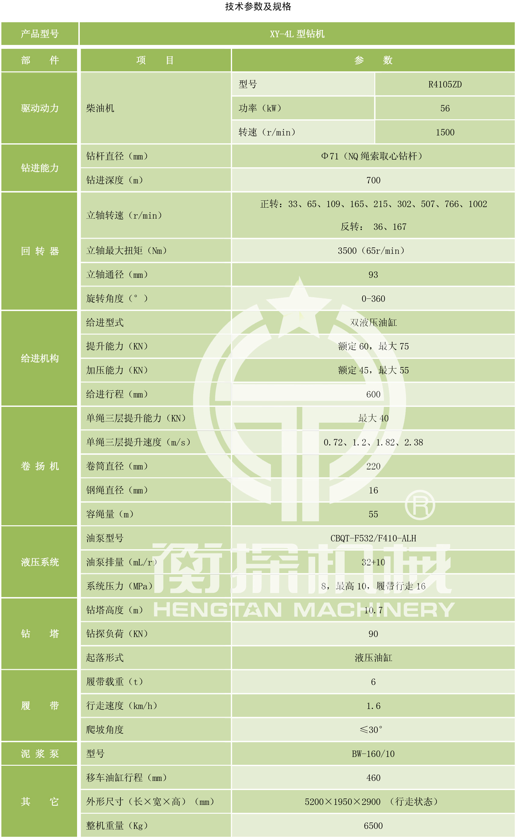 5.自带泥浆泵、绳索绞车、履带行走和液压起落钻塔,能利用自身动力实现整机移动,搬迁方便,辅助时间短,劳动强度低,工作效率高。